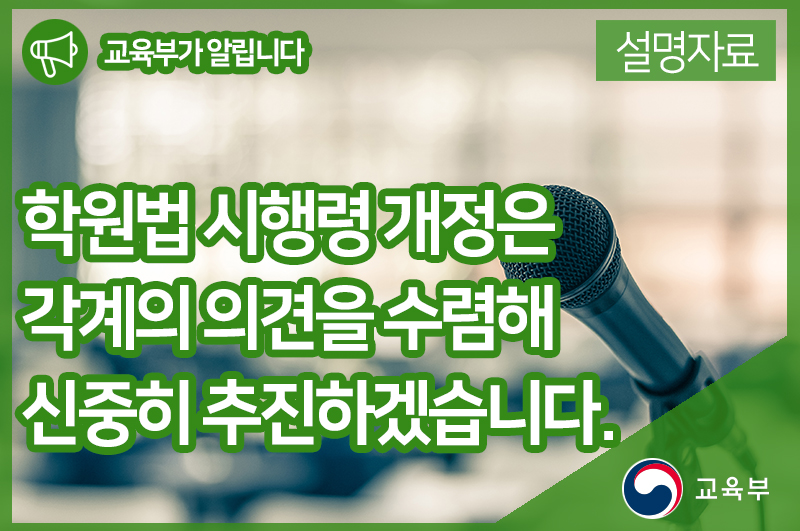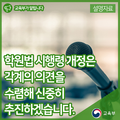 교육부는 입법예고 기간에 수렴한 시․도교육청, 교육단체, 시민단체 등의 다양한 의견을 반영해 「학원법 시행령」 개정을 신중하게 추진하도록 하겠습니다.