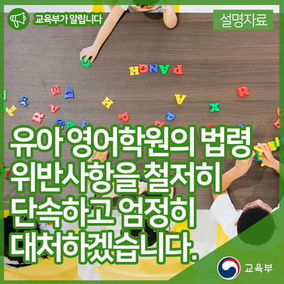 유아 영어학원의 ‘영어유치원’ 명칭 사용 등 법령 위반사항을 철저히 단속하고 있으며, 앞으로도 엄정히 대처해 나가겠습니다. 본문