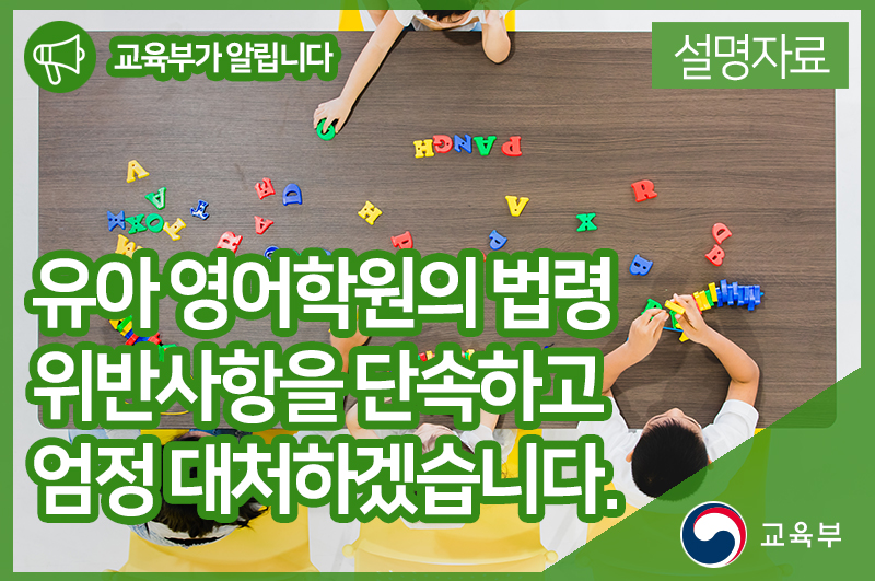 교육부는 명칭사용 위반 등 유아 대상 영어학원의 불법행위 근절을 위해 매년 보건복지부, 여성가족부 및 시․도교육청이 참여하는 관계부처 합동점검을 통해 지도․단속을 실시해오고 있습니다.