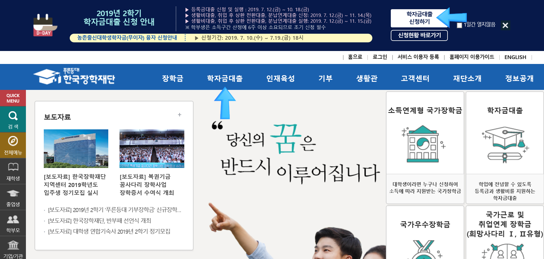 사이트 상단에 나타나는 팝업창을 활용해 '학자금 대출 신청하기' 버튼을 누르거나 혹은 학자금 대출 카테고리에 들어가 '학자금 대출 신청하기' 버튼을 눌러 신청 절차를 진행할 수 있습니다.