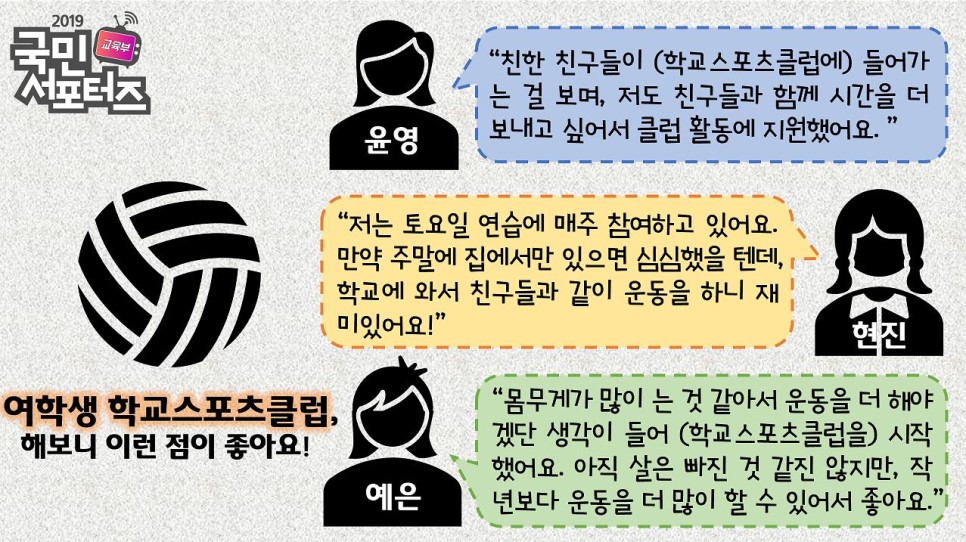 교육부는 여학생 선호 종목의 지속적인 개발·보급과 여학생을 위한 학교 스포츠클럽을 매년 확대하여 지원(2014년 1,000팀 → 2015년 1,200팀 → 2016년 1,500팀 → 2017,2018년 1,700팀)하고 있습니다. 더 나아가 전국 시·도교육청은 특색 있는 여학생 체육활동 우수사례들을 발굴하여 지원하고, 각급 학교에 보급할 것이라고 합니다.