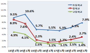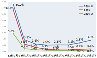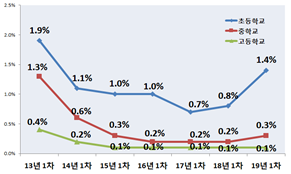 - 학교급별로 초 1.4%, 중 0.3%, 고 0.1%로 조사되어, 초·중학교는 각각 0.6%p, 0.1%p 증가했고, 고등학교는 지난해와 동일했다.