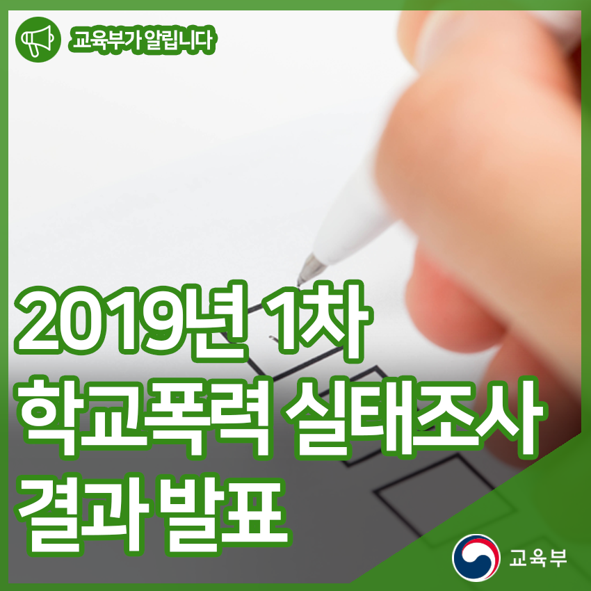 교육부(부총리 겸 교육부장관 유은혜)는 17개 시·도교육감이 초·중·고등학교(초4~고3) 학생들을 대상으로 실시한 ‘2019년 1차 학교폭력 실태조사(전수조사)’ 결과를 발표했다.
