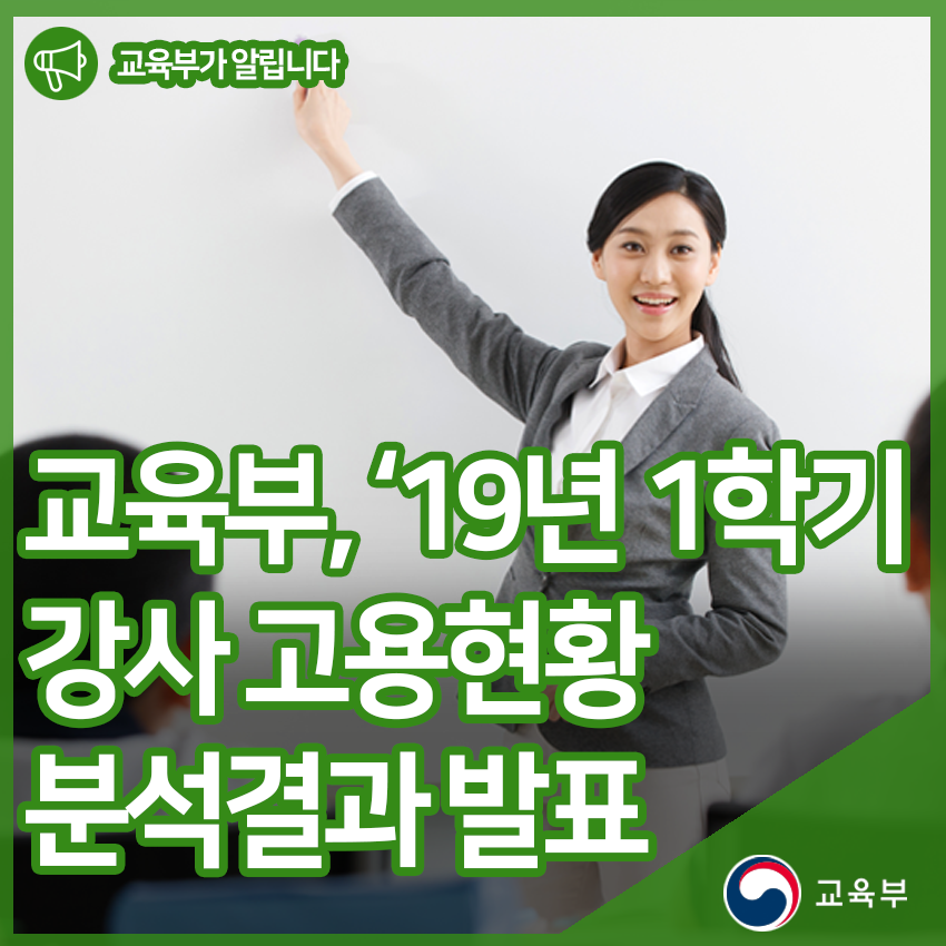 교육부(부총리 겸 교육부장관 유은혜)는 8월 30일(금) 2019년 1학기 대학 강사 고용현황 분석결과를 발표하였다. 이번 분석은 개정 고등교육법(강사법) 적용 399개교의 실질적인 강사 고용 변동을 파악하기 위하여 이루어졌다. 한국교육개발원(KEDI)의 교육기본통계조사 자료를 기반으로, 1명의 강사가 여러 대학에 출강할 경우 중복 집계되던 기존 집계 방식과 달리 강사로 재직하고 있는 실제 인원 수를 반영하였다.