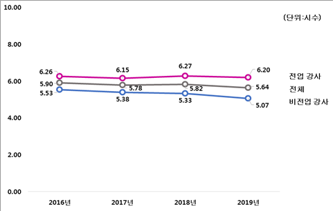 ’19년 1학기 강사의 1인당 강의시수는 소폭 하락세이나, 전업강사는 연도별로 증감을 반복하여, 일정한 수준을 유지하고 있다.