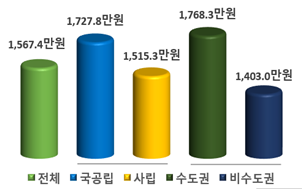 - 수도권대학은 1,768.3만원으로 전년(1,740.5만원)보다 27.8만원(1.6%), 비수도권대학은 1,403.0만원으로 전년(1,368.2만원)보다 34.8만원(2.5%) 증가하였다.