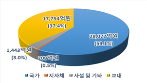 - 장학금 총액의 재원별 구성을 살펴보면, 국가 장학금* 2조 8,072억원(59.1%), 교내 장학금 1조 7,754억원(37.4%), 사설 및 기타** 1,443억원(3.0%), 지방자치단체 208억원(0.5%) 순이다.