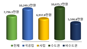 - 수도권대학 전임교원 1인당 연구비 10,675.7만원으로 전년(10,332.6만원)보다 343.1만원(3.3%), 비수도권대학 5,590.8만원으로 전년(5,313.0만원)보다 277.8만원(5.2%) 증가하였다.