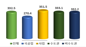 - 수도권대학 333.1만원으로 전년(335.3만원)보다 2.2만원(△0.7%), 비수도권대학 332.2만원으로 전년(337.3만원)보다 5.1만원(△1.5%) 감소하였다.