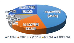 - 적립금 구성 비율을 살펴보면, 건축기금 45.7% 가장 높았고, 다음으로 특정목적기금(25.6%), 장학기금(18.1%), 연구기금(9.6%), 퇴직기금(1.0%) 순이었다.