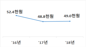 ’18년 일반대학 및 교육대학의 신·편입생* 평균 입학전형료(’18년 결산 기준)는 49.0천원으로 전년(48.8천원)보다 0.2천원(0.4%) 증가하였다.