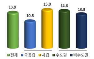 - 국·공립대학 학자금 대출 이용률 10.5% 사립대학(15.0%)보 4.5%p 낮았고, 수도권대학 14.6% 비수도권대학(13.3%)보 1.3%p 높았다.