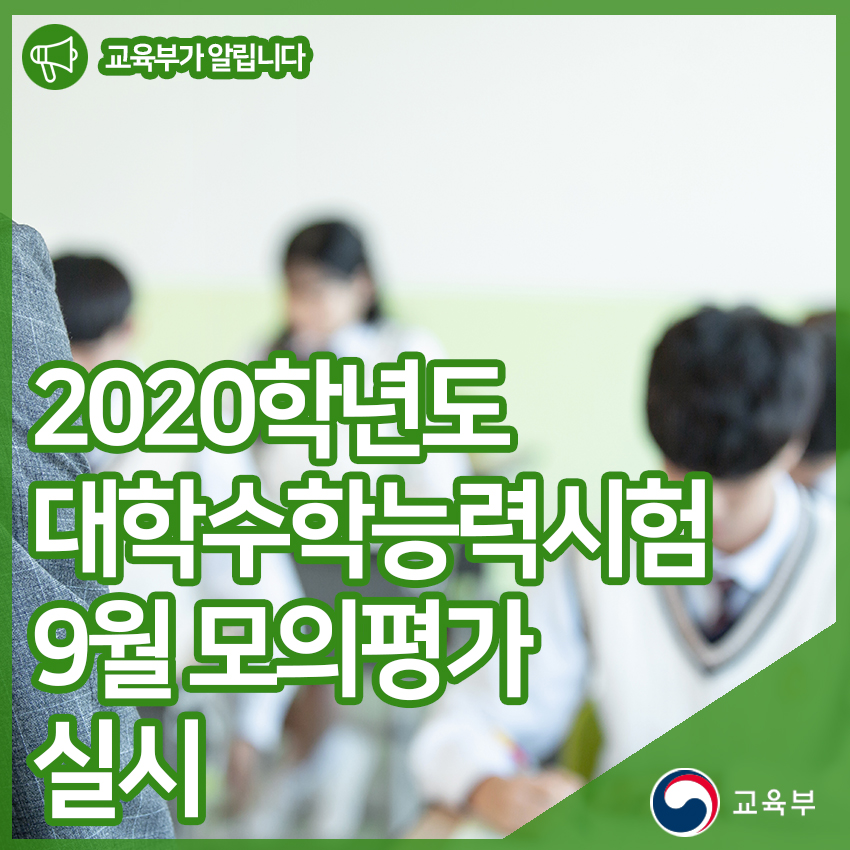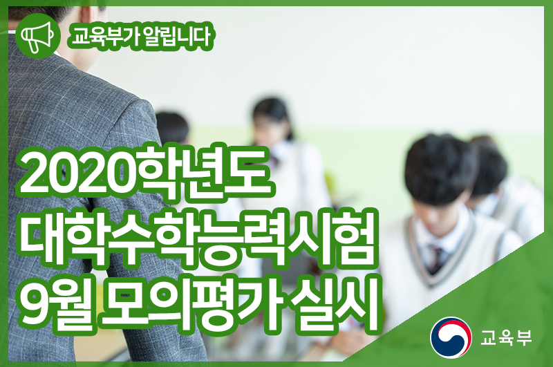 한국교육과정평가원(원장 성기선)은 2020학년도 대학수학능력시험 9월 모의평가를 9월 4일(수) 오전 8시 40분부터 전국 2,101개 고등학교(교육청 포함)와 435개 지정학원에서 동시에 실시한다고 발표하였다.