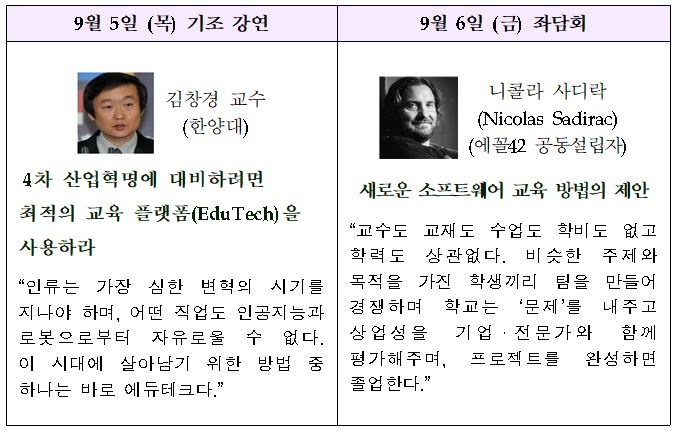 기조 연사로 9월 5일(목)에는 한양대 과학기술정책학과 김창경 교수가 강연하며, 9월 6일(금)에는 니콜라 사디락 (Nicolas Sadirac) 에꼴 42 설립자의 좌담회(진행: 이화여대 소효정 교수)가 이어진다.