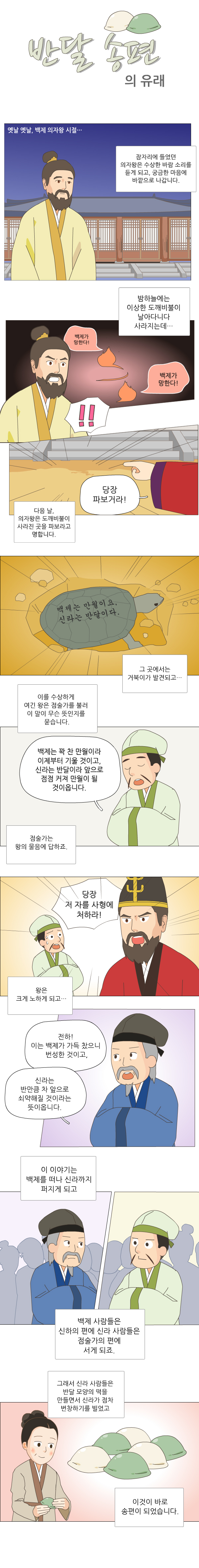 반달송편의 유래를 잘 읽어보았나요? 옛날 농경 사회에서 달은 아주 중요한 의미를 지니고 있었습니다. 달의 변화에 따라 시간을 예측하고, 이에 맞추어 농사를 지었기 때문입니다. 그래서 이렇게 중요한 달의 모양을 본떠 자연스럽게 송편을 빚게 되었던 것이죠. 소를 넣기 전에는 보름달 모양이고 소를 넣고 접으면 반달 모양이 되니, 송편 한 개에 보름달, 반달 모양을 모두 담아 달의 발전과정과 변화를 송편에 담았다는 유래가 있습니다.