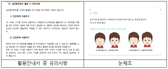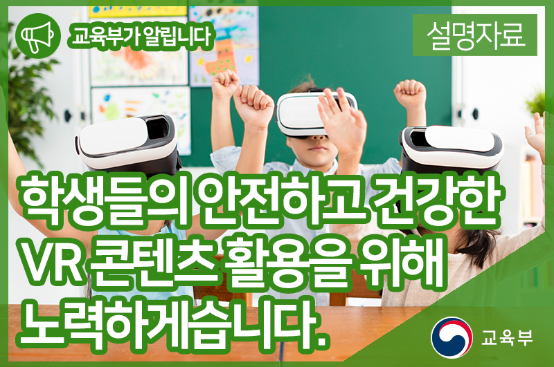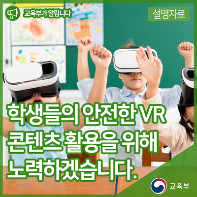 아울러, 교육부는 VR 콘텐츠를 포함하여 스마트기기 이용에 따른 과몰입, 신체적 부작용 등을 예방하기 위해 시력보호 눈운동‧역기능 예방 체조, 디지털기기 올바른 활용 가이드북 보급 등 예방교육을 함께 추진하고 있습니다.