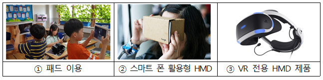 일반적으로 VR 콘텐츠 이용은 ① 스마트패드·스마트폰 ② 스마트 폰 활용 HMD*제품(구글 카드보드 등) ③전용 HMD 기기**로 구분되나, 디지털교과서 내 VR 콘텐츠는 스마트 패드와 스마트 폰을 활용(①․②)하는 형태로, 13세 미만 연령 제한 등이 있는 VR 전용기기(③)로는 디지털 교과서의 VR 콘텐츠는 구현되지 않습니다.