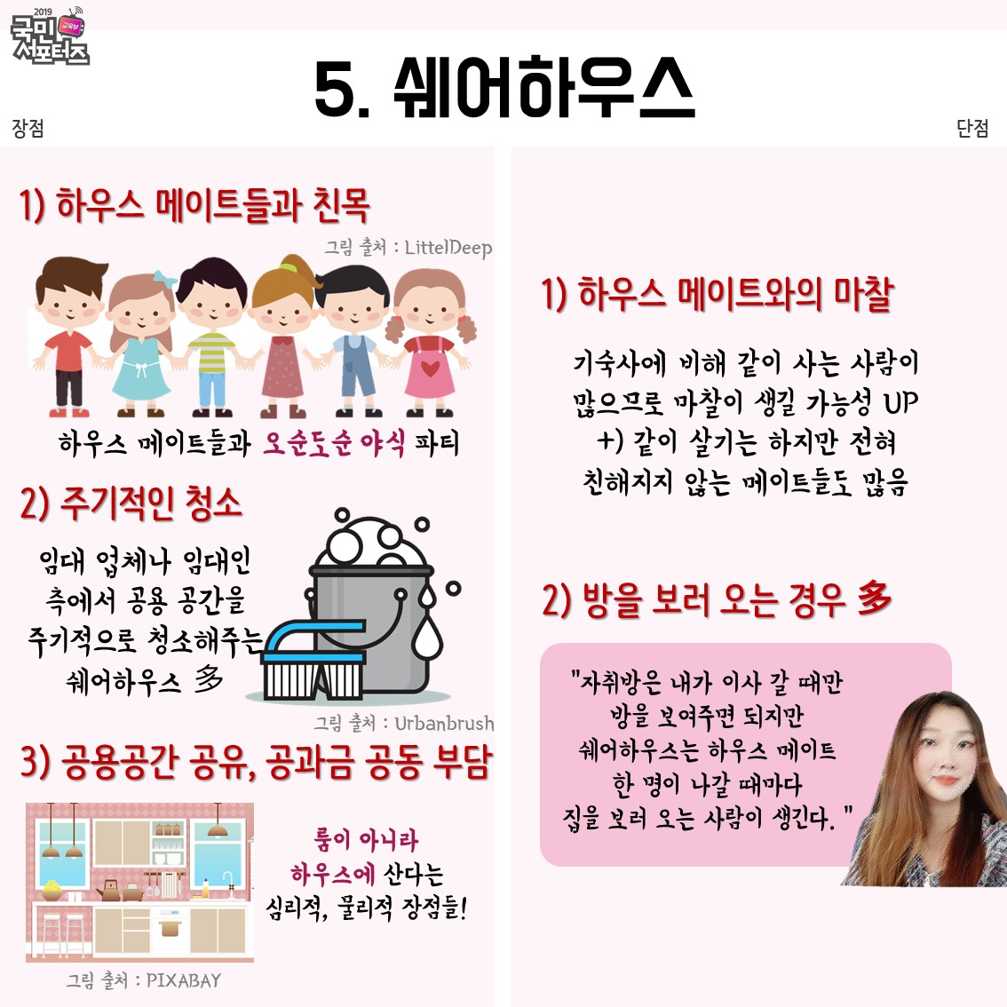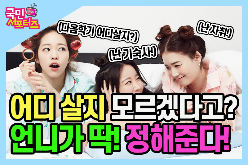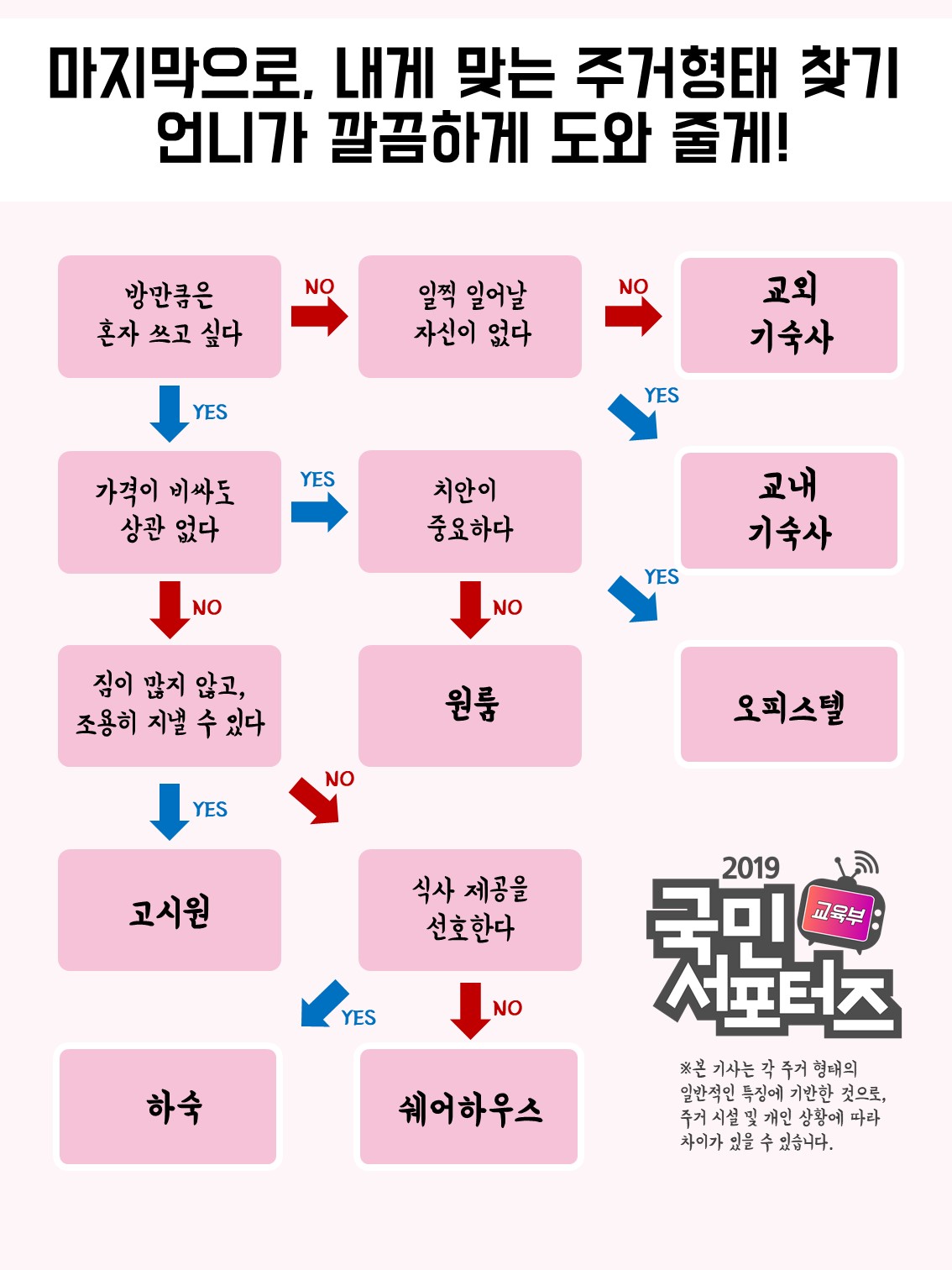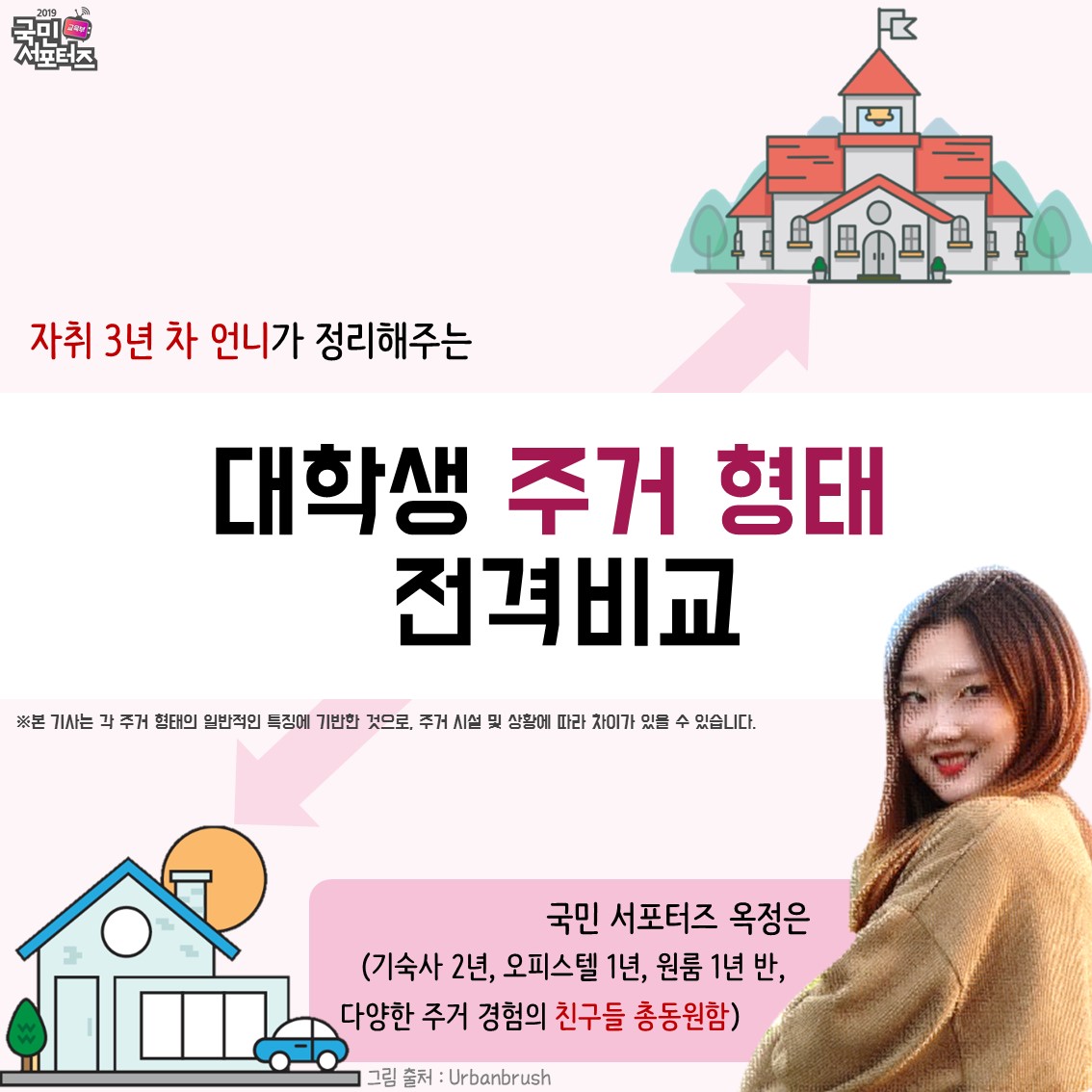 전공 서적부터 학원비까지 대학생들의 지출이 늘어가고, 또 다양해져가는 가운데, 높은 대학가의 주거 비용은 많은 학생들에게 큰 부담으로 작용합니다. 그래서 학생들은 다양한 주거 형태를 고려하여 자신에게 적절한 주거 시설을 찾기 위해 노력하실 것 같아요! 그러나 대학에 갓 입학한 새내기들이 각 주거 형태의 장단점을 정확히 파악하기란 쉽지 않을거예요. 많은 새내기들은 광고나 부동산의 말만 믿고 주거 시설을 선택하여 불만족스러운 계약기간을 보내곤 합니다. 저 역시 몸과 마음이 불편한 1학년 생활을 보낸 한 명입니다. 하지만 더 이상 자신과 맞지 않는 주거 형태를 선택하는 대학생들이 없도록 교육부 국민 서포터즈가 '대학생 주거 형태 전격 비교'를 준비했습니다!