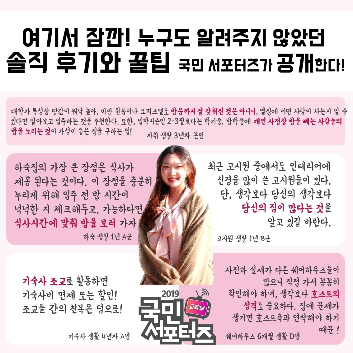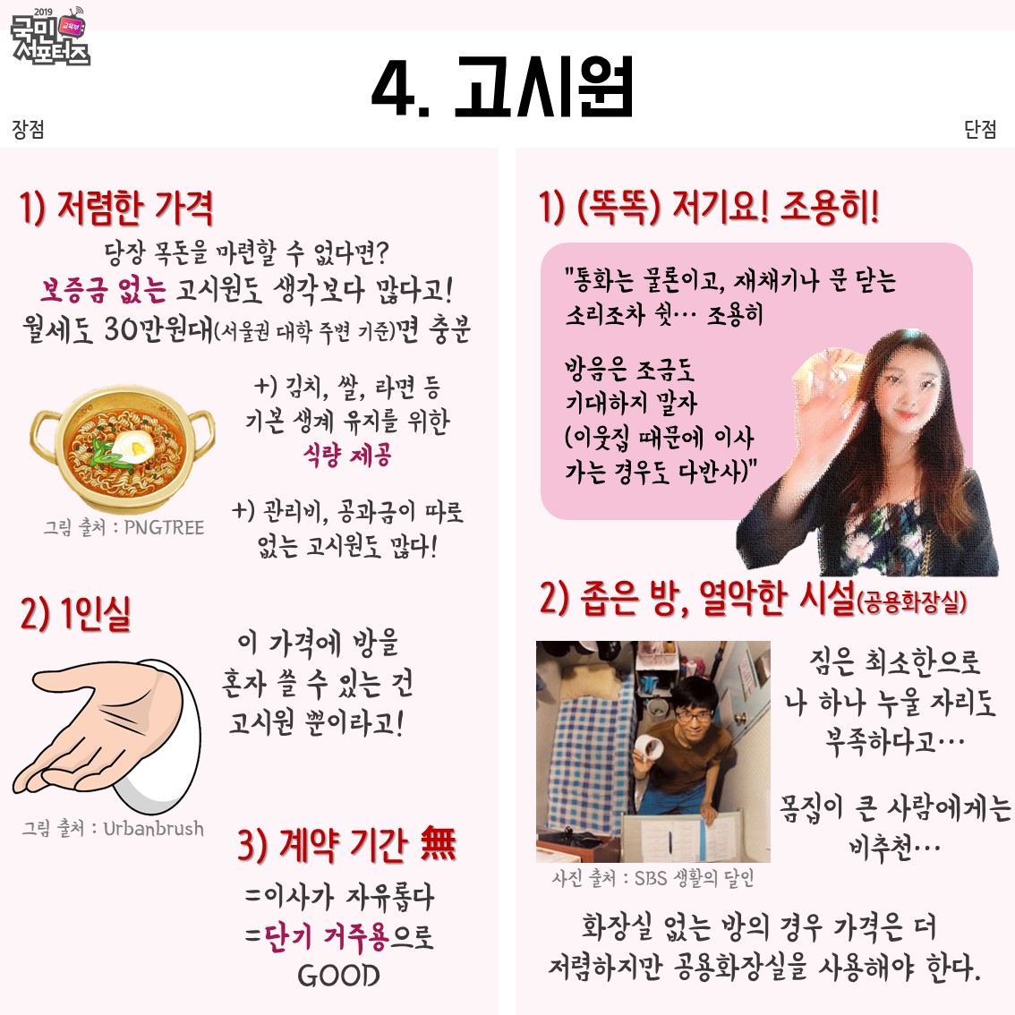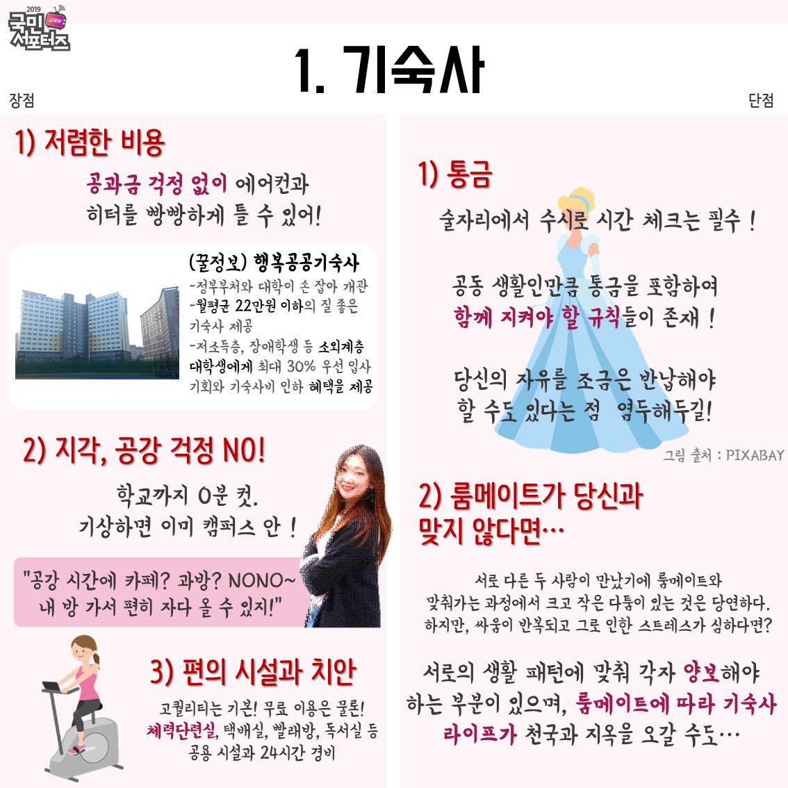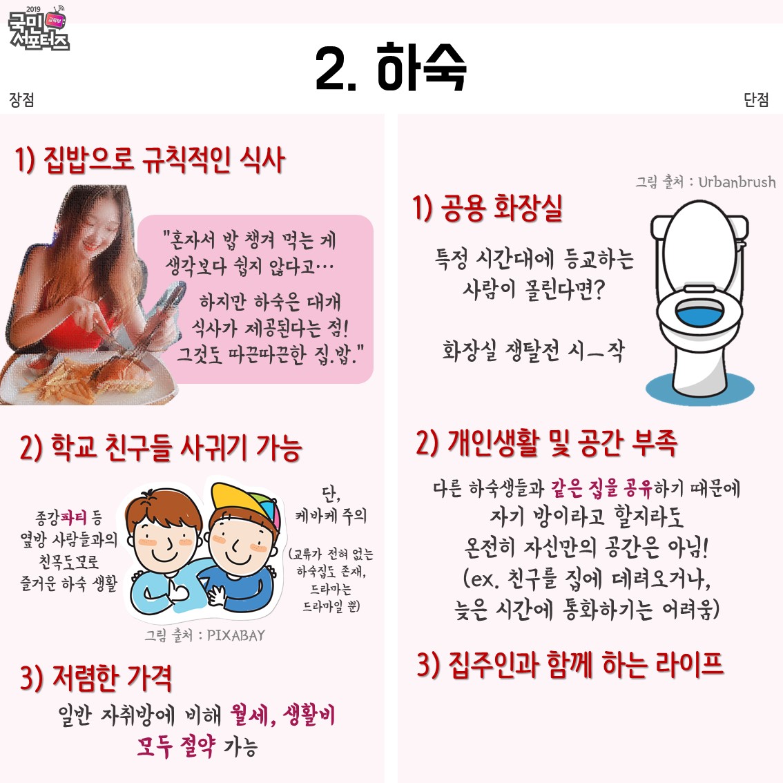 전공 서적부터 학원비까지 대학생들의 지출이 늘어가고, 또 다양해져가는 가운데, 높은 대학가의 주거 비용은 많은 학생들에게 큰 부담으로 작용합니다. 그래서 학생들은 다양한 주거 형태를 고려하여 자신에게 적절한 주거 시설을 찾기 위해 노력하실 것 같아요! 그러나 대학에 갓 입학한 새내기들이 각 주거 형태의 장단점을 정확히 파악하기란 쉽지 않을거예요. 많은 새내기들은 광고나 부동산의 말만 믿고 주거 시설을 선택하여 불만족스러운 계약기간을 보내곤 합니다. 저 역시 몸과 마음이 불편한 1학년 생활을 보낸 한 명입니다. 하지만 더 이상 자신과 맞지 않는 주거 형태를 선택하는 대학생들이 없도록 교육부 국민 서포터즈가 '대학생 주거 형태 전격 비교'를 준비했습니다!
