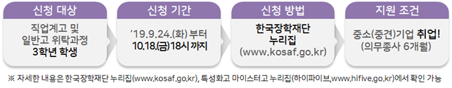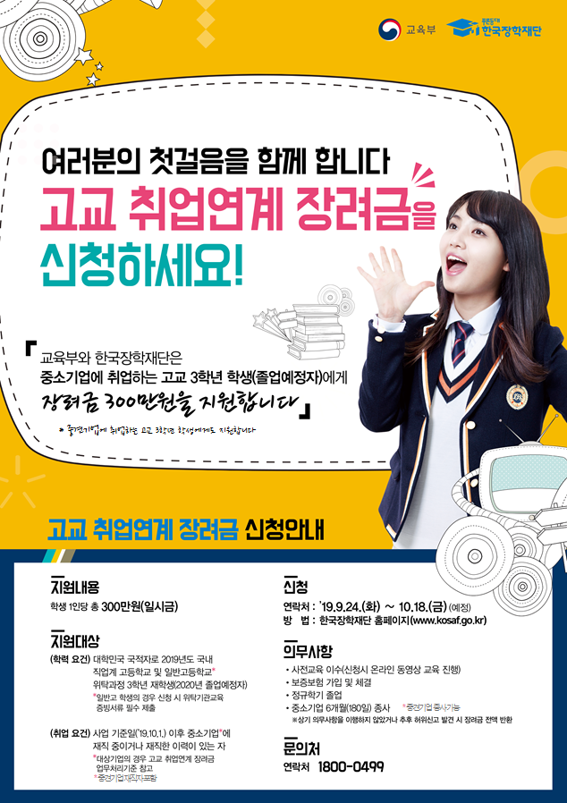 2019년 고교 취업연계 장려금 신청을 9월 24일(화)부터 10월 18일(금)까지 한국장학재단 누리집(www.kosaf.go.kr)에서 접수한다.