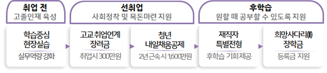 그 외에도 교육부는 청년의 다양한 성장경로를 구현하기 위해, 미래직업능력과 기초소양을 겸비한 고졸 인재 육성과 취업 후 사회 정착 및 역량개발을 지속적으로 지원할 계획이다.