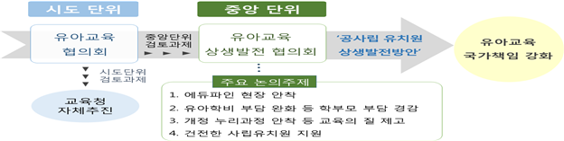 올해 5월 교육부와 시·도 교육청은 현장 소통을 바탕으로 ‘상생발전방안’ 마련을 위해 지역과 중앙에 협의회를 구성하기로 했고, 그 간 교육청 중심으로 지역별 협의회를 만들어 지역의 여건을 반영한 제도 개선 과제를 발굴하는 등의 활동을 진행했다. 지역별 협의회가 제안한 내용 중 보다 큰 틀에서 논의가 필요한 사항에 대해 중앙단위인 ‘유아교육 상생발전협의회’에서 협의하여 ‘상생발전방안’에 담아낼 예정이다.