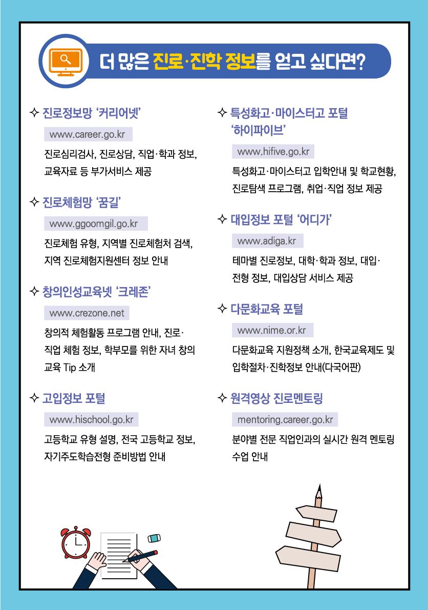 ◇ 특성화고·마이스터고 포털 '하이파이브' 특성화고·마이스터고 입학안내 및 학교현황, 진로탐색 프로그램, 취업·직업 정보 제공 |