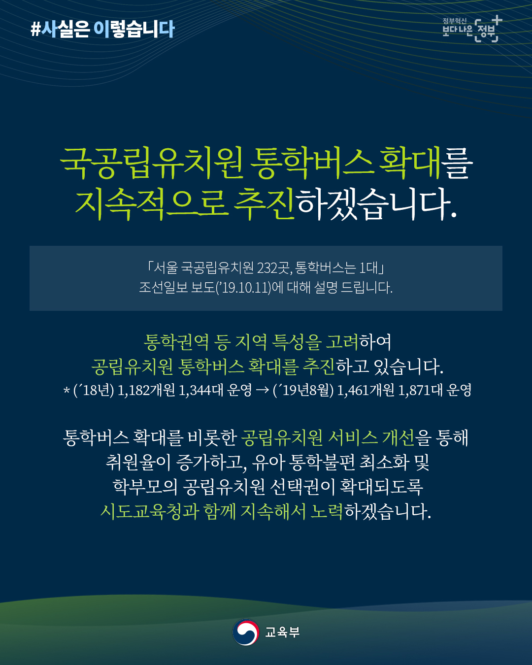통학버스 확대를 비롯한 공립유치원 서비스 개선을 지속해서 추진하고 있습니다.