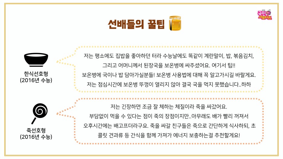 선배들의 꿀팁처럼 여러분 모두 수능 날 어떠한 음식과, 상황이