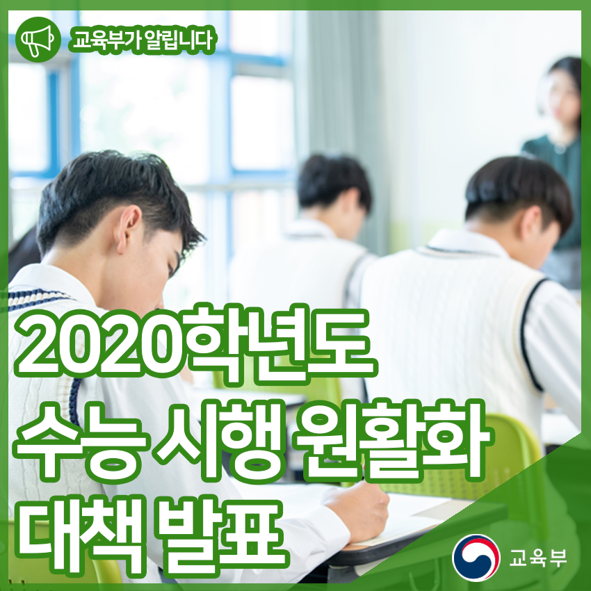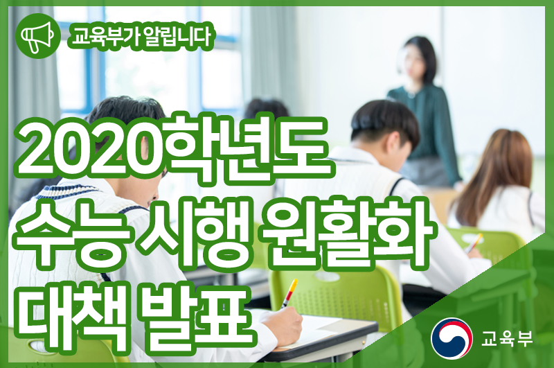 교육부(부총리 겸 교육부장관 유은혜)는 올해 대학수학능력시험(이하 ‘수능’)을 안정적으로 시행하기 위한 「2020학년도 수능 시행 원활화 대책」을 10월 22일(화) 국무회의에서 발표하였다.