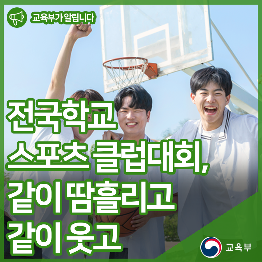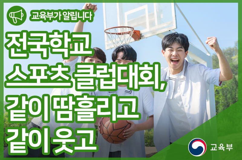 교육부(부총리 겸 교육부장관 유은혜)는 10월 26일(토)부터 12월 1일(일)까지 「제12회 전국학교스포츠클럽대회」를 23개 종목에 걸쳐 전국 각지에서 개최한다.