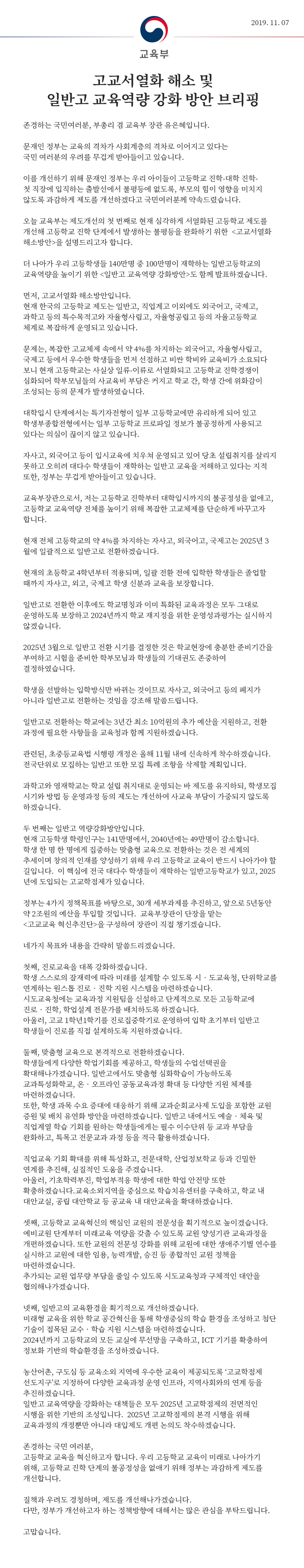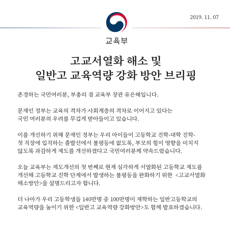 | [자사고·외고·국제고의 일반고 전환은 시도교육청 등 의견을 수렴하여 결정하였습니다] (0) | 2019.11.08 |