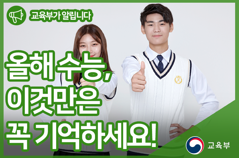 교육부(부총리 겸 교육부장관 유은혜)는 11월 14일(목)에 실시될 2020학년도 대학수학능력시험에 응시하는 수험생들을 위한 ‘수험생 유의사항’을 안내하였다.