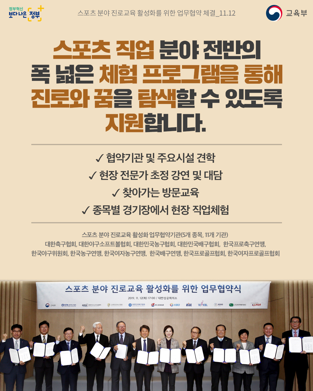 스포츠 분야 5개 종목, 11개 기관과 진로교육 활성화 업무협약을 체결하고,