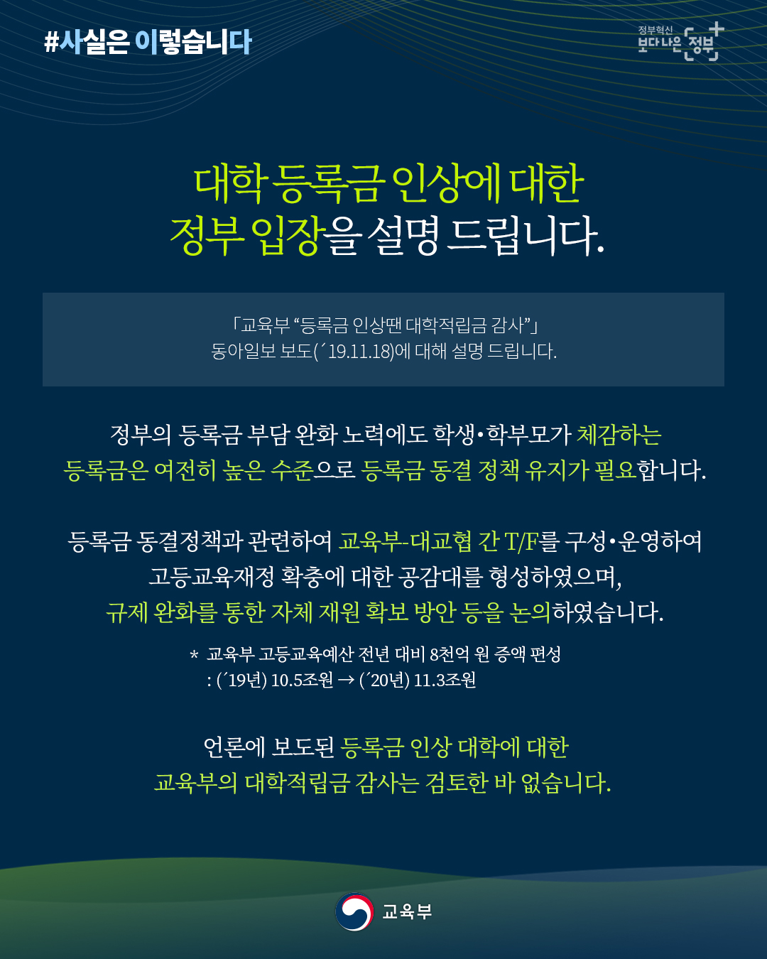 대학 등록금 인상에 대한 교육부 입장을 설명 드립니다. 2019년 11월 18일 동아일보(박재명, 김수연 기자...