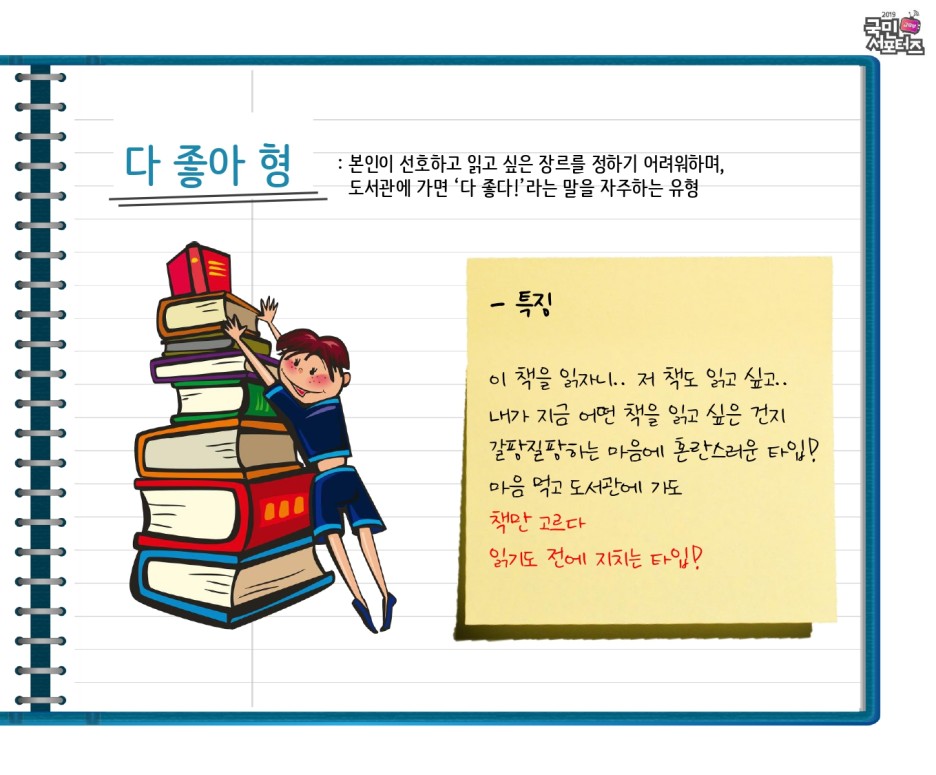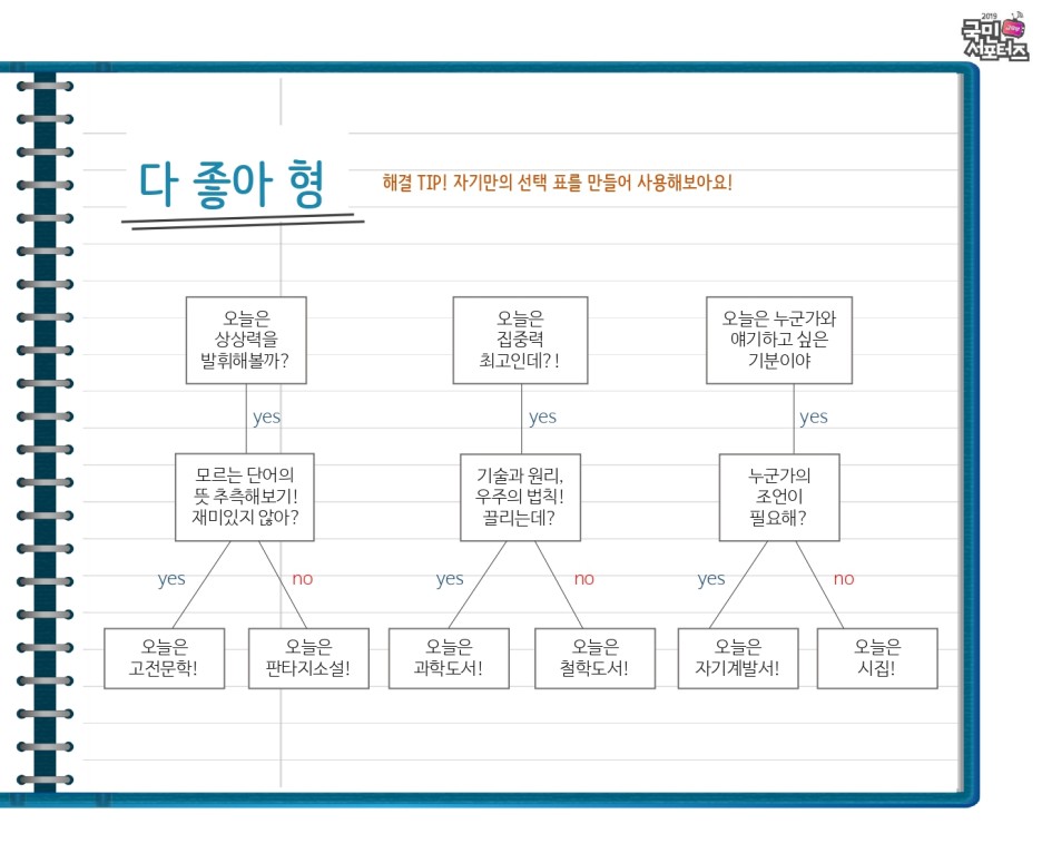 독서광 2 : 다 좋아 형이라니 이름이 너무 웃기지 않나요..? 하지만 이만큼 맞는 말도 없는 것 같네요.. 하하! 저는 처음 '책 한 번 읽어볼까?'하고 도서관에 가자마자 철학, 예술, 인문, 과학 등등 쓰여있는 분류대 앞에서 한참을 헤매다 다시 집으로 돌아왔었어요. 지금 당장 내가 어떤 분야를 읽고 싶은지 생각 정리가 도저히 되지 않아서, 이 책 저 책 목차만 뒤적이다 진이 다 빠지고 말았습니다. 이에 저는 인터넷 여러 군데를 검색해보다가 '책 고르기 표' 같은 것을 보고 나만의 표를 만들어보자 결심했어요. 직접 예시처럼 종이에 표를 그리지 않아도 머릿속에 나에게 던질 수 있는 몇 가지 질문 알고리즘을 만들고, 그에 따른 행동 방향을 결정한다면 그게 바로 여러분만의 '책 고르기 표'아니겠어요?