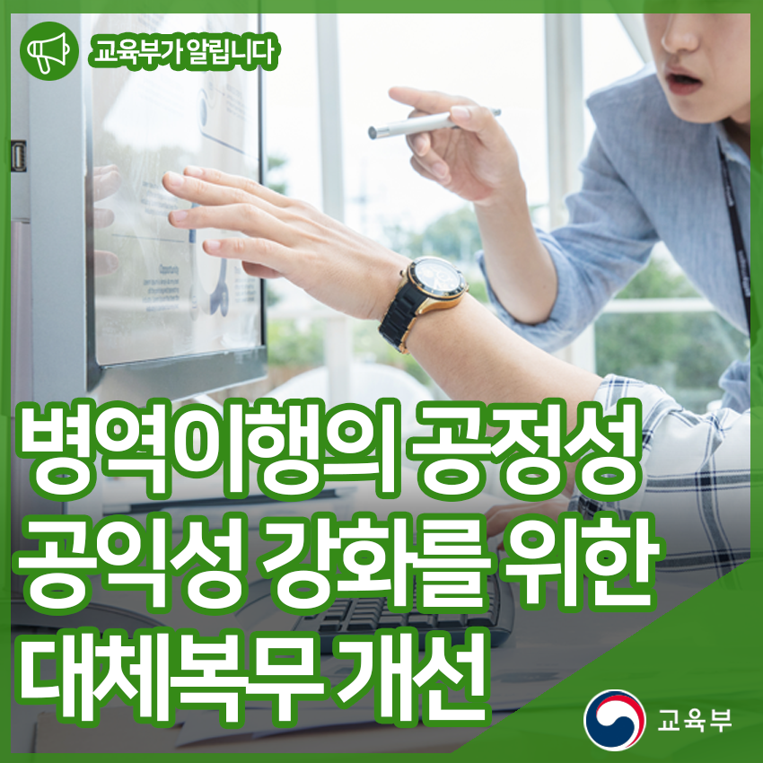 정부는 향후에도 의무병역제도가 형평성 있게 운영되고 있으며, 대체복무제도가 국가적인 기여가 되고 있다고 국민들이 체감할 수 있도록 지속적으로 운영 실태를 점검하고 제도를 개선하겠습니다.