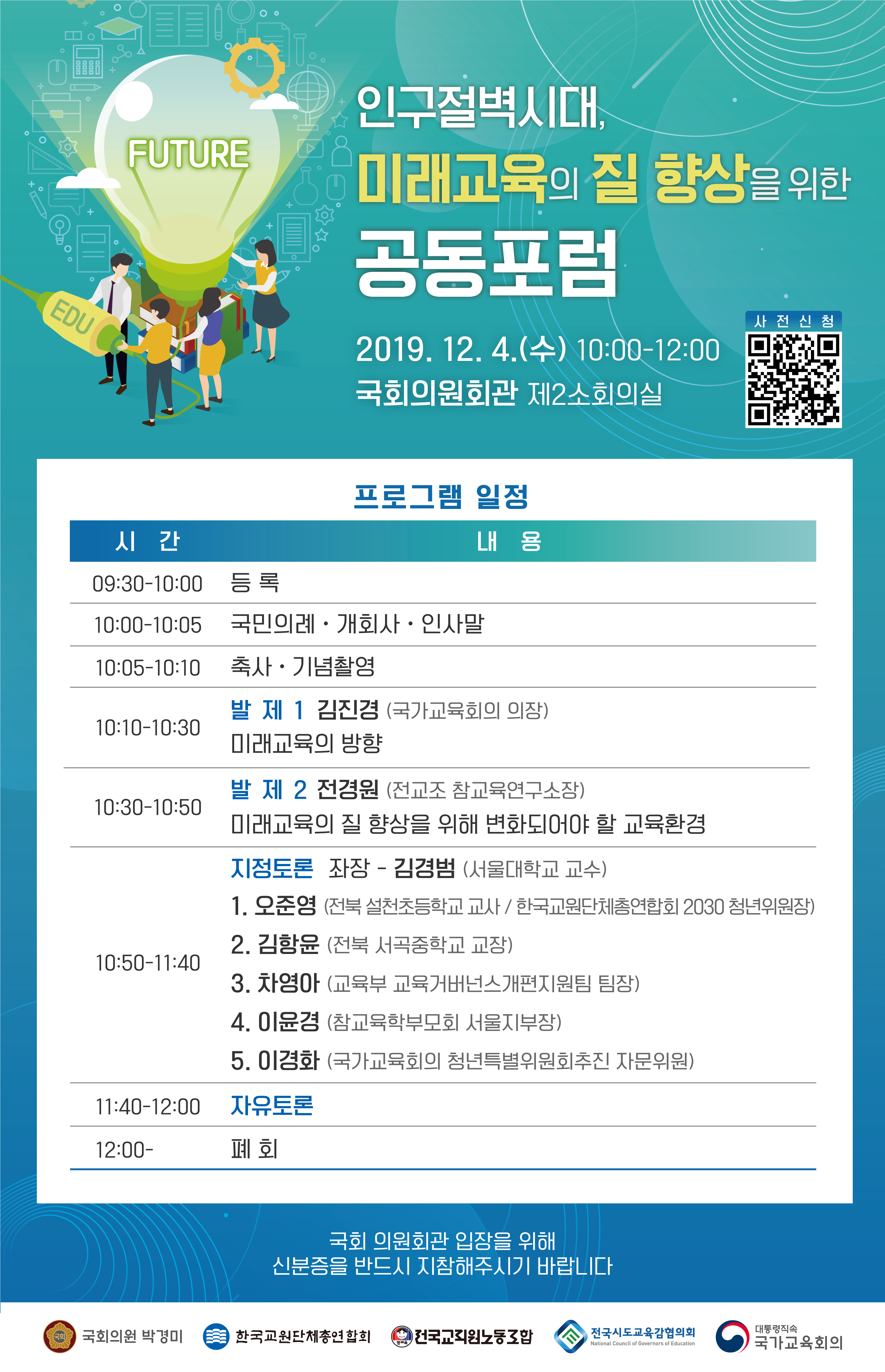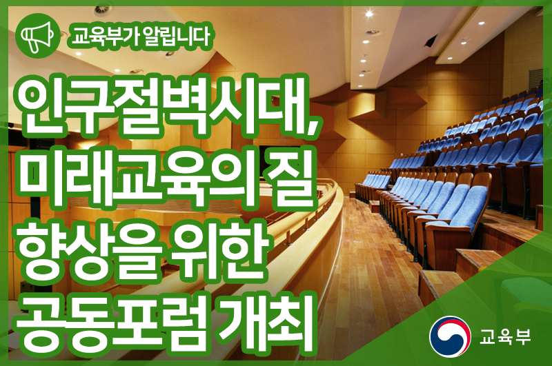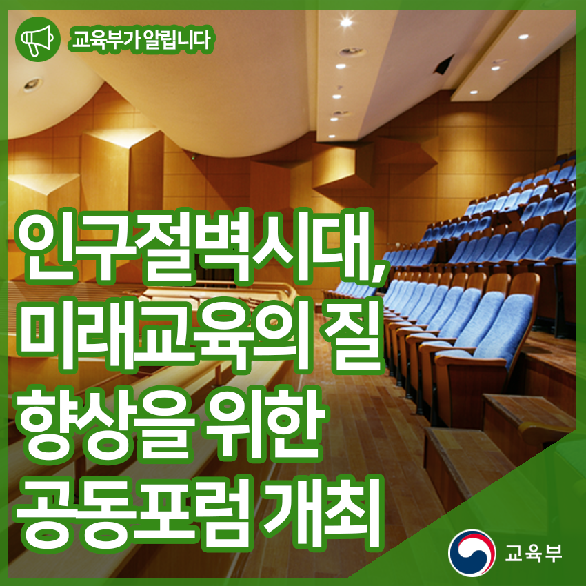 대통령직속 국가교육회의(의장 김진경)는 국회의원 박경미, 한국교원단체총연합회(회장 하윤수), 전국교직원노동조합(위원장 권정오), 전국시도교육감협의회(회장 김승환 전라북도교육감)와 함께 『인구절벽시대, 미래교육의 질 향상을 위한 공동포럼』(이하 공동포럼)을 개최한다.