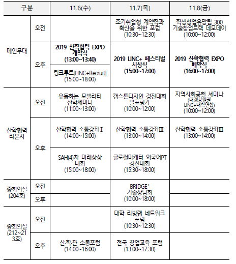 LINC+성과 전시관과 링크루트 외에도 조기취업형 계약학과 육성사업 성과관, 학교기업지원사업 성과관, 산업단지캠퍼스조성사업 성과관, 학생 창업유망팀 300 기술창업트랙 시제품 전시회 등 ‘2019 산학협력 엑스포’에서는 수많은 사람들의 땀과 노력이 전시되었습니다. 어쩌면 누군가는 이 기사를 읽고 본인과는 무관한 산업 이야기라고 생각할 수도 있습니다. 그러나 산학은 더 많은 사람들이 참여하고 공유할수록 발전하는 우리 모두의 축제입니다. 실제로 산학협력 엑스포는 학생과 학부모들이 참여할 수 있는 보드게임, 포토존과 이벤트 등의 공간도 마련하여 더 많은 이들과 함께하고자 노력하고 있습니다.