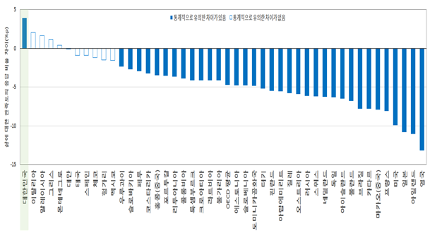 <삶에 대한 만족도(‘만족함’의 비율) 차이(PISA 2018 - PISA 2015)>