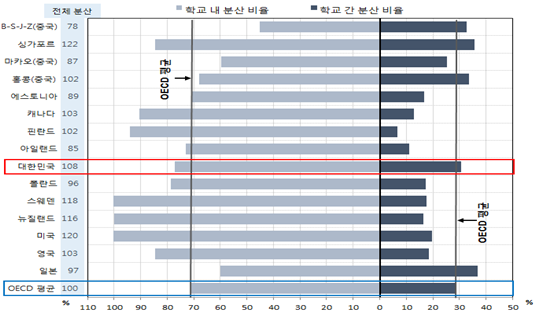 우리나라 읽기 성취의 학교 내, 학교 간 차이는 OECD 평균보다 높은 것으로 나타났다.