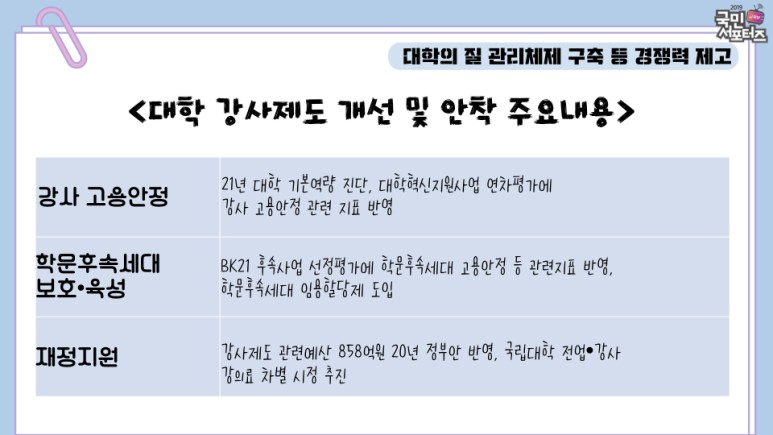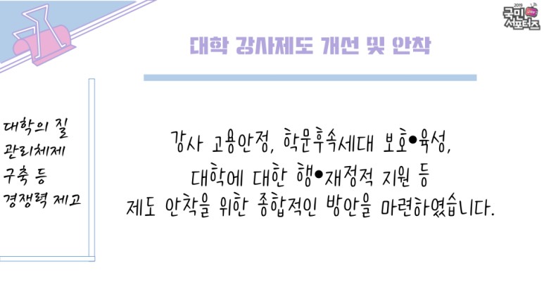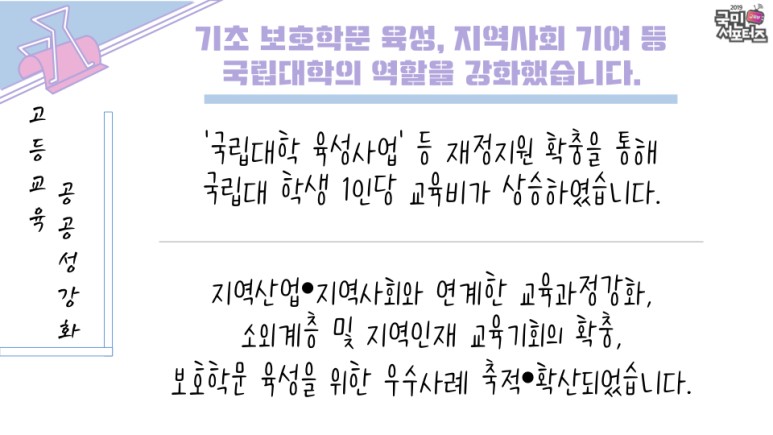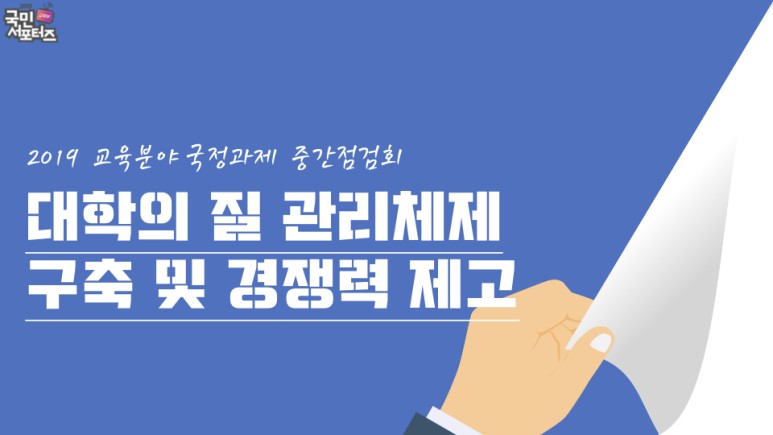 오늘 이렇게 2019 교육 분야 국정과제 중간 점검회의 '2분과:대학정책'에 대한 토론을 함께 살펴보았습니다. 교육분야 국정과제의 성과 및 개선 필요 사항을 되돌아보는 시간을 가짐으로써 앞으로 대한민국 교육에 대한 발전이 더욱 기대되는데요. 아울러, 보다 나은 내일의 교육을 향한 국민의 무한한 관심과 응원이 필요하다는 생각을 갖게 되었습니다. 교육분야 국정제에 국민 여러분의 많은 관심 부탁드립니다!