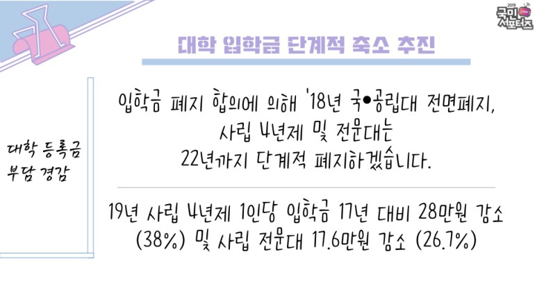 •기본적으로 반값 등록금이라든지 등록금 동결과 같은 수혜적 정책이 10년 이상 지속되었기 때문에 이것을 단기간 안에 바꾸는 것은 무리가 있다는 한계를 인식하고 대안을 모색하여야 합니다.