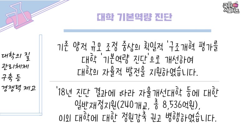 •대학 기본역량 진단을 통해서 재정 지원과 연계하고 그것을 일반 재정 지원 방식으로 하여 대학 자율성 측면에서 큰 성과를 보였습니다.
