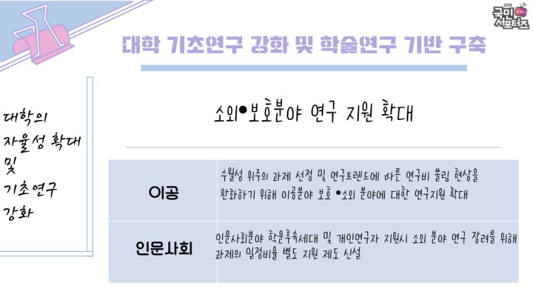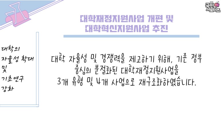 지난 11월 11일, 문재인 정부가 출범한 지 어느덧 절반이 흘러온 이 시점에서 보다 더 나은 대한민국 교육을 위하여 교육 분야 국정과제를 되돌아보고 향후 어떠한 방향으로 나아가야 할지 논의해보는 2019 교육 분야 국정과제 중간 점검회가 열렸습니다. 오전에는 다섯 가지 분과별 토론이 진행되었고, 오후에는 문재인 정부 전반기 국정과제 주요 성과 및 토론 발표가 이어졌습니다. 오늘은 교육부 국민서포터즈가 직접 참가한 오전 분과 토론 중 2분과(대학정책)에 대해 자세히 알아보겠습니다.