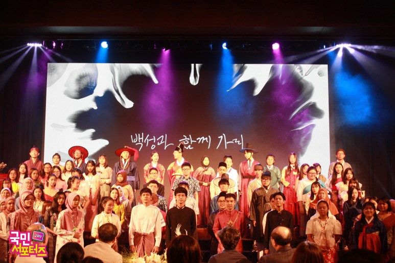 1부 마지막에 했던 모든 참가자가 참여한 뮤지컬은 관람객들의 감탄을 이끄는 데 충분한 공연이었습니다. '한글'이 이렇게나 아름다운 글자였던 것을 몸소 느끼게 해주었으며, 우리의 성군 세종대왕님이 다시금 존경스러워지는 순간이었답니다. 노래 가사 한 마디 한 마디가 가슴을 뭉클하게 만들었고, 한복 이외에 다른 나라의 전통의상이 다 섞여있는 모습이 이 대회의 의미를 나타내주었습니다!
