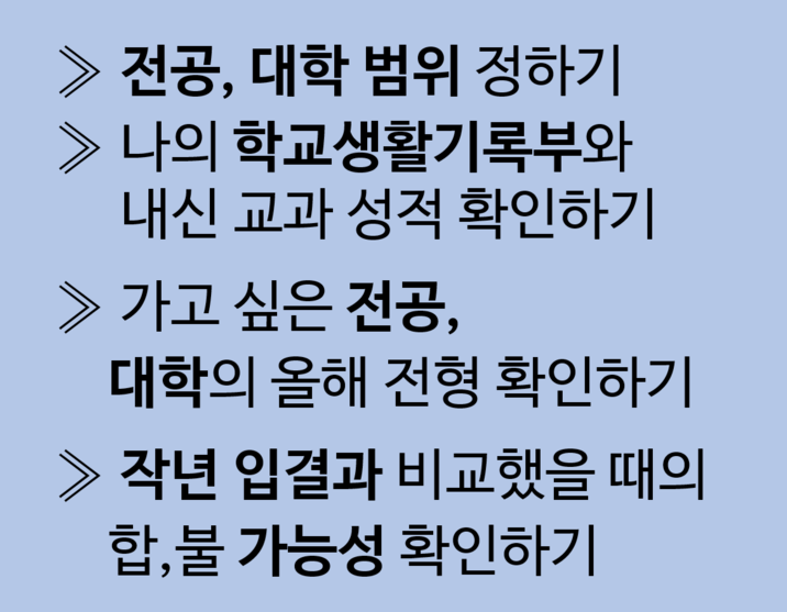 미리 내가 가고 싶은 전공, 대학 등을 정하고 갈 수 있는 전형과 가능성을 판별해보는 것은 매우 중요합니다.