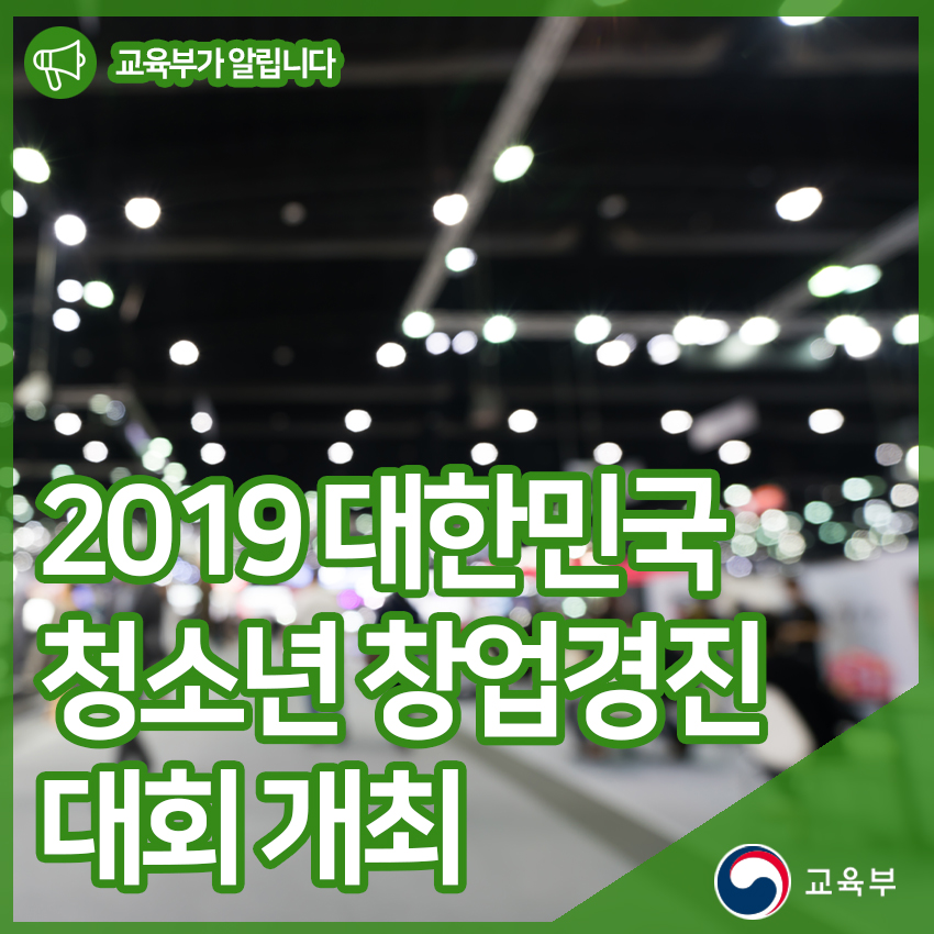 교육부(부총리 겸 교육부장관 유은혜)는 12월 27일(금) 전남순천만생태문화교육원에서 17개 시·도교육청 및 한국청년기업가정신재단(이사장 황철주)과 함께 ‘2019 대한민국 청소년 창업경진대회’의 본선행사를 개최한다.