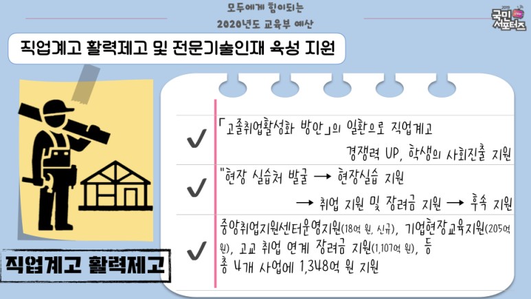고교무상교육, 누리과정 등 교육비 투자를 확대하여 학생·학부모의 교육비 부담이 경감될 수 있다는 점이 인상적이었고, 고등교육 부문 재정확충이 중점적으로 이뤄지는 만큼 국가혁신 성장의 토대가 되는 대학의 경쟁력이 강화되길 바랍니다. 더불어 직업계고 활력제고 및 전문기술인재 육성 지원을 통해 급변하는 산업구조에 걸맞는 인재들이 많이 양성될 수 있는 기회가 마련되길 기대해봅니다!