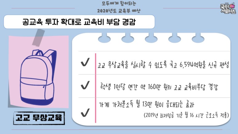 2020년 고2·고3 학생(약 88만 명)을 대상으로 고교 무상교육을 실시할 수 있도록 국고 6,594억원을 신규 편성하였다고 합니다! 학생 1인당 연간 약 160만 원의 고교 교육비가 경감됨에 따라 가계 가처분소득 월 13만 원이 증대되는 효과를 가져다 준다고 하여 학생과 학부모의 기대가 큽니다.